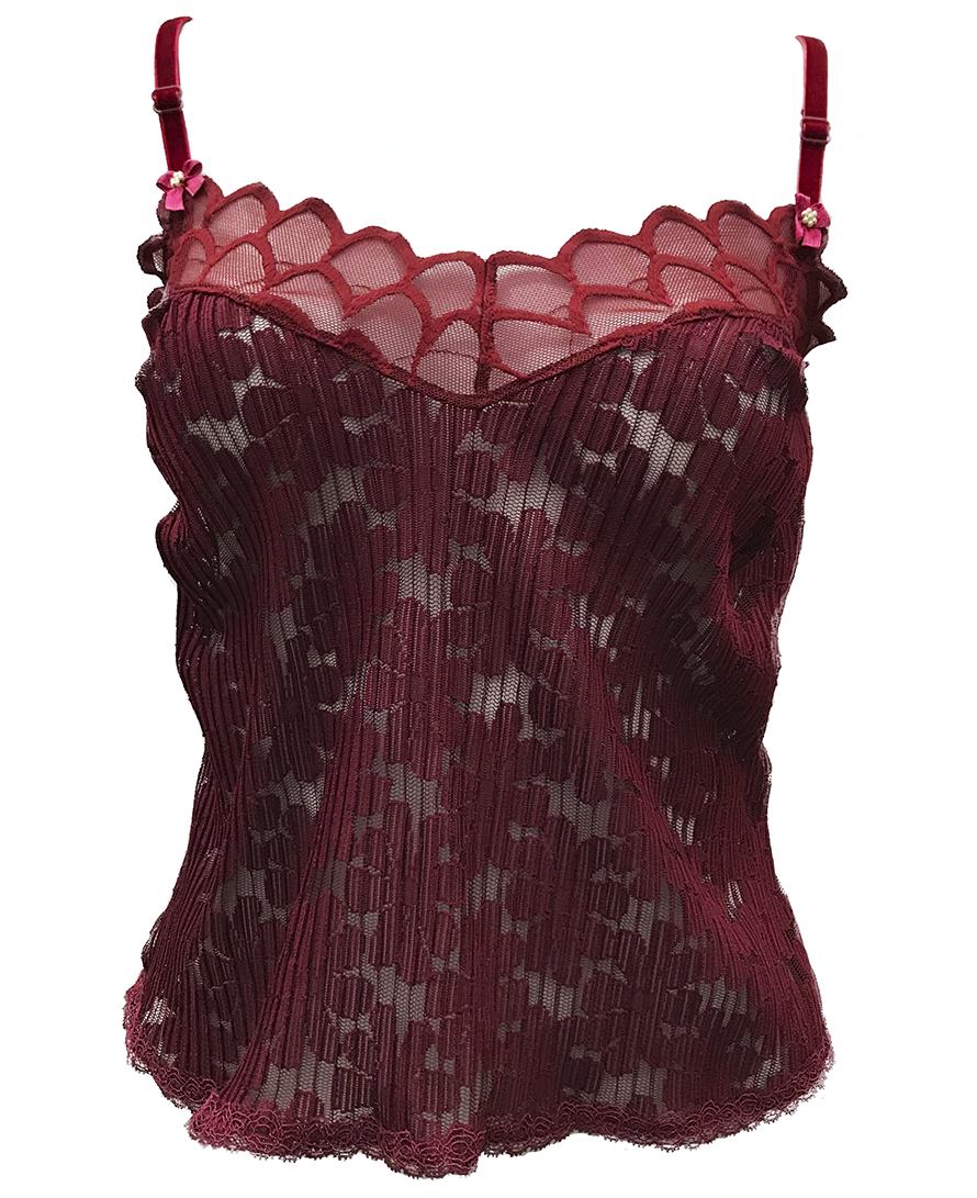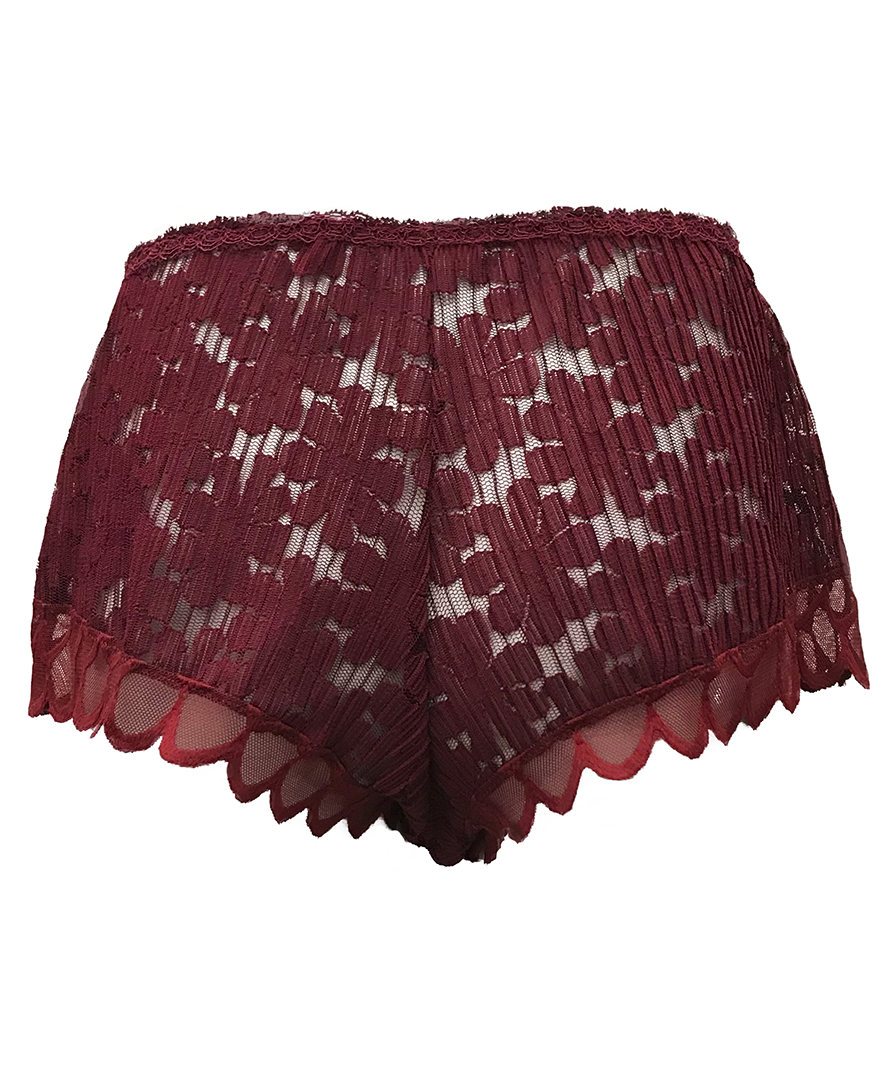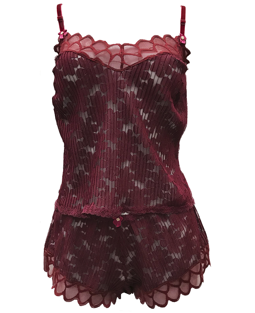 Conjunto de shorts y top en blonda plisada y encaje con fino detalle de tira de terciopelo.